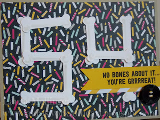 I used the retired Halloween framelits to cut out a bunch of bones using Whisper White Cardstock. I then used a Blender Pen and a Crumb Cake stamp pad to add the shading. I adhered them with Glue Dots. I stamped the sentiment with Basic Black Archival ink onto a piece of Crushed Curry Cardstock and added another design from the It's My Party DSP Stack.